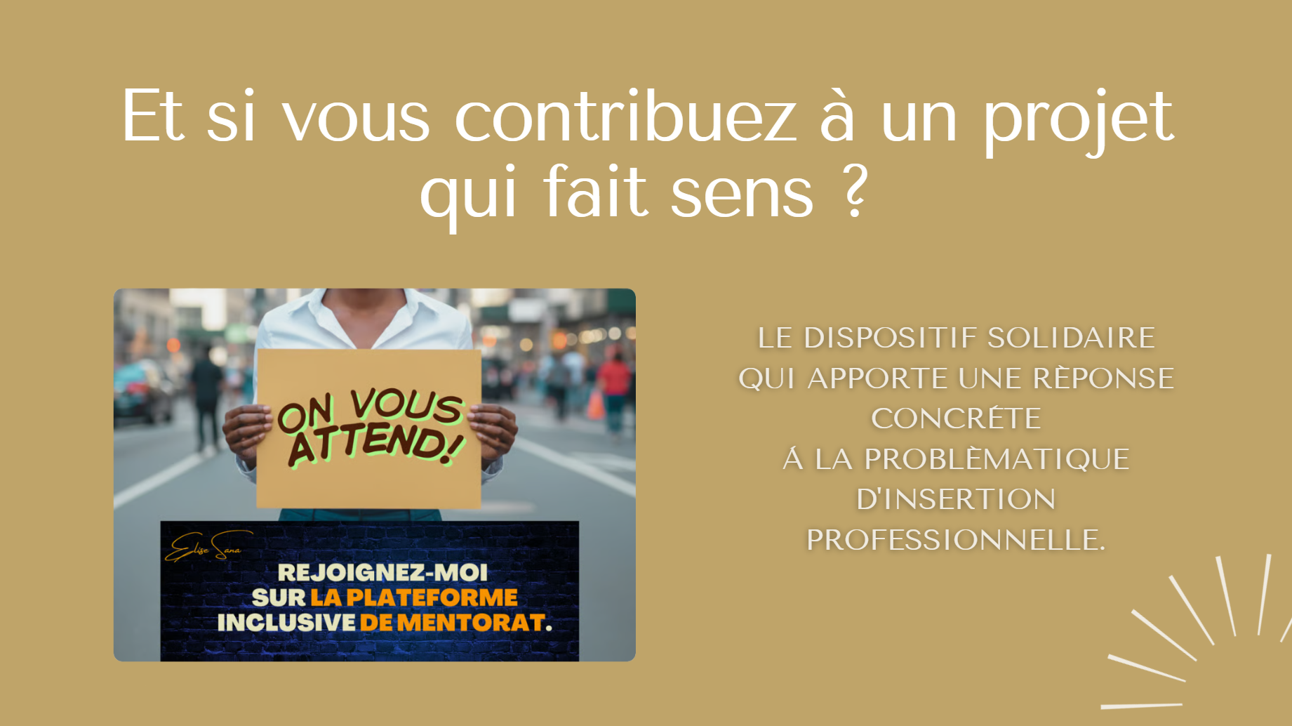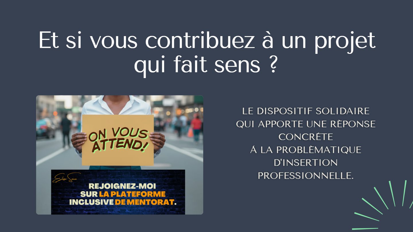 J'ai créée la plateforme inclusive de mentorat gratuit pour qu'un mentorat de qualité soit accessible à tous et notamment aux profils qui n'ont pas accès aux dispositifs existants d'aide à la recherche d'emploi.