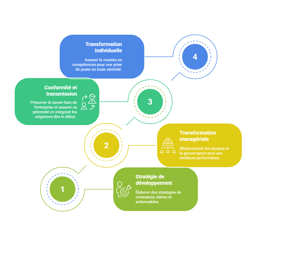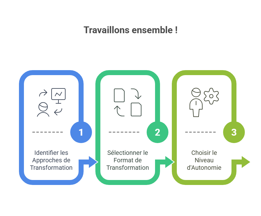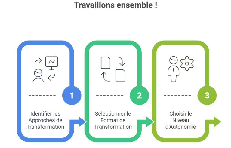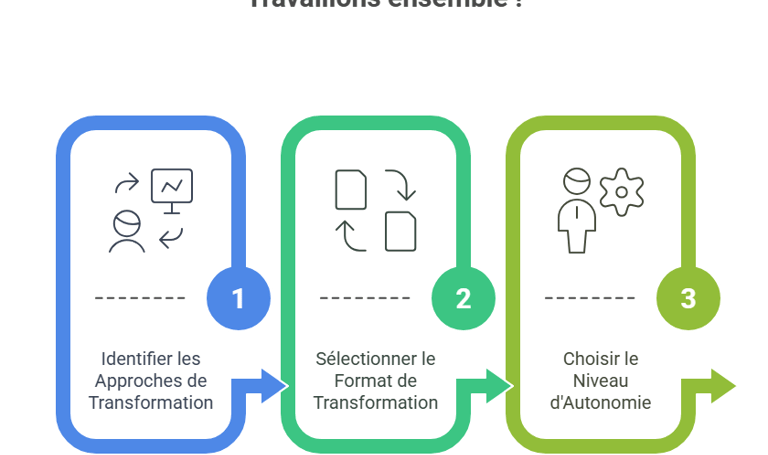 Voici les différentes étapes que vous devez suivre si nous sommes appelés à travailler ensemble pour la réussite de votre projet de transformation :